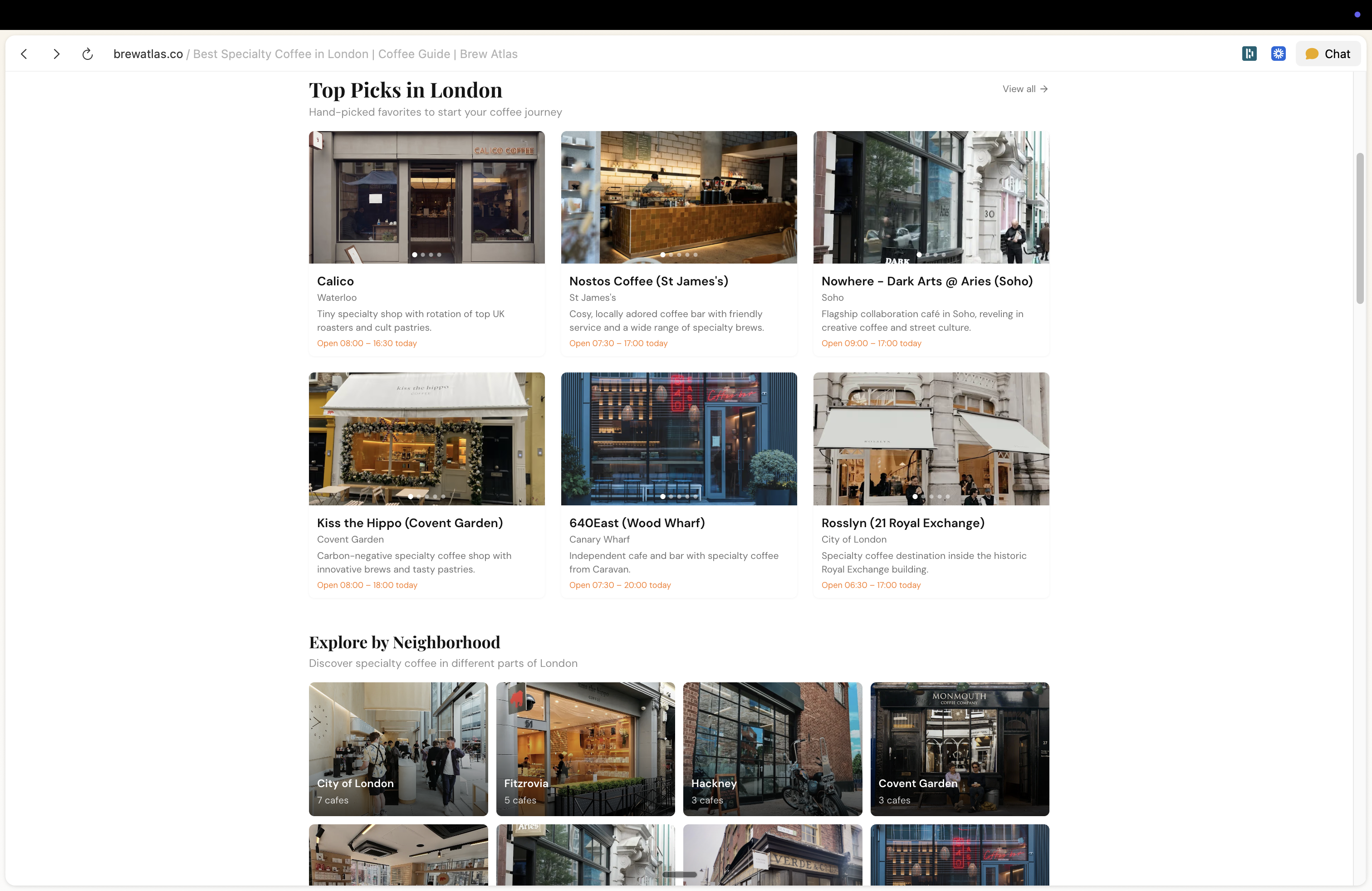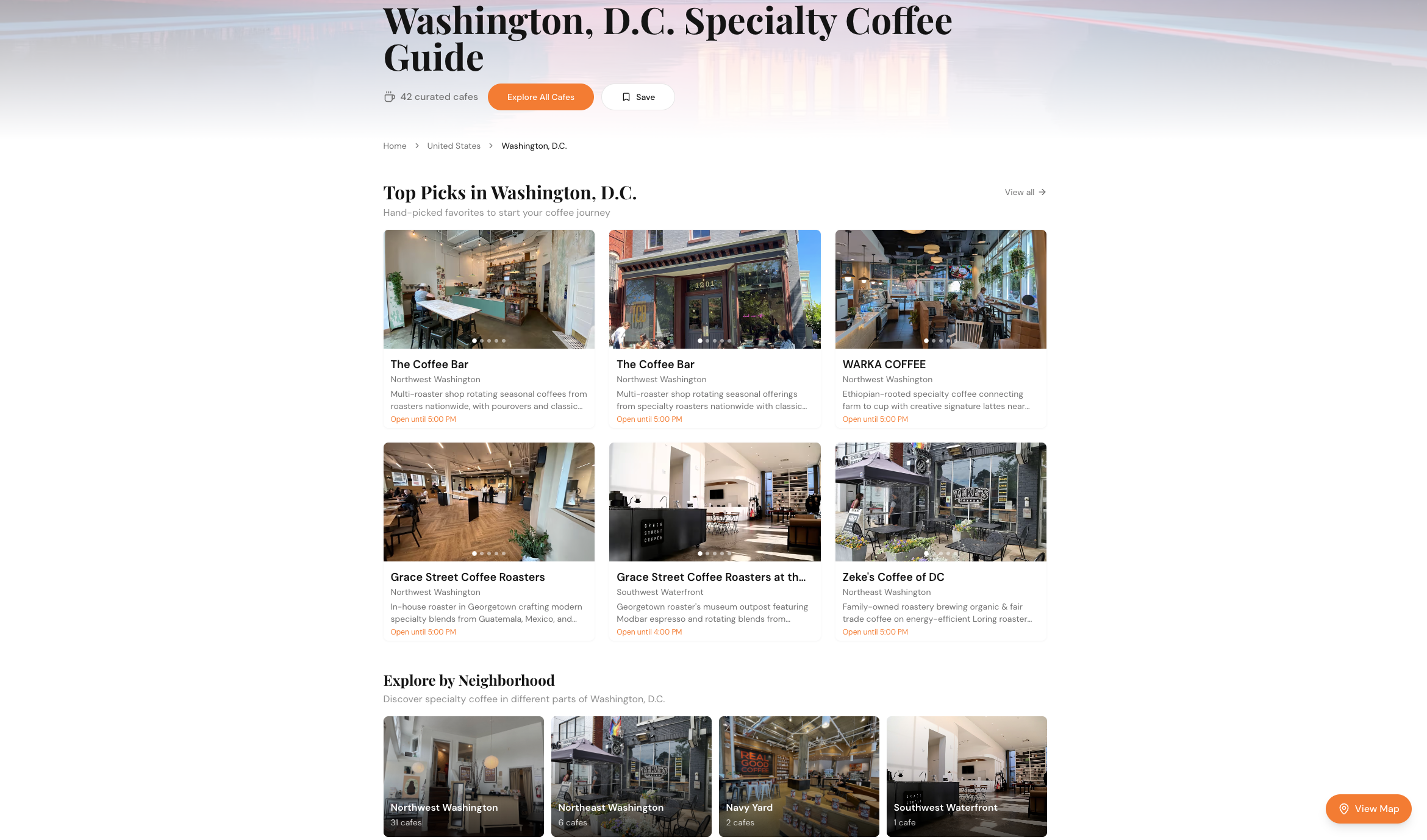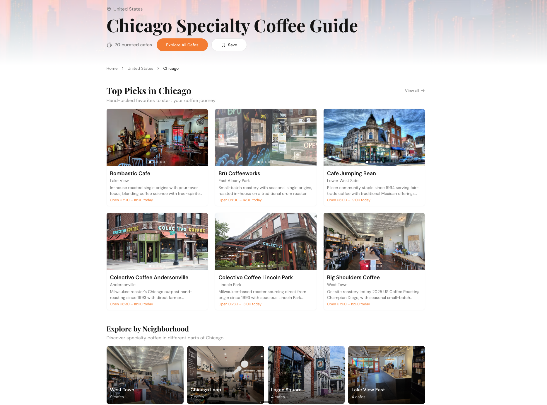 - Explore by Neighborhood grid to discover cafes in different parts of the city