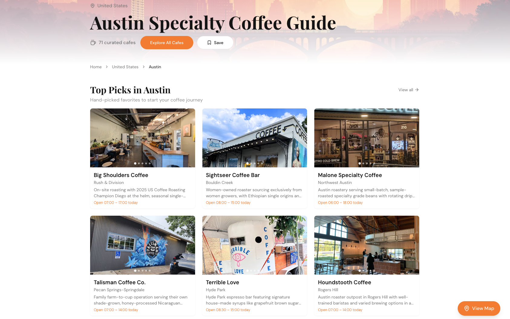 - 71 hand-picked specialty cafes across Austin