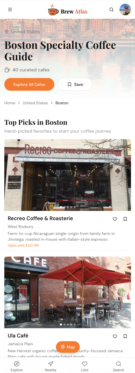 Beantown joins BrewAtlas with 43 curated specialty coffee shops. From Jamaica Plain roasters to Back Bay pour-over spots, explore Boston's deeply rooted third-wave coffee scene.