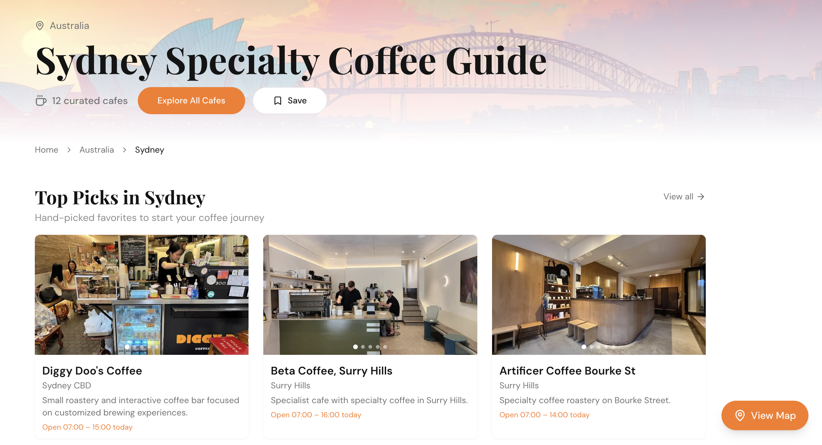 - One tap to go from a single cafe to the full city map view