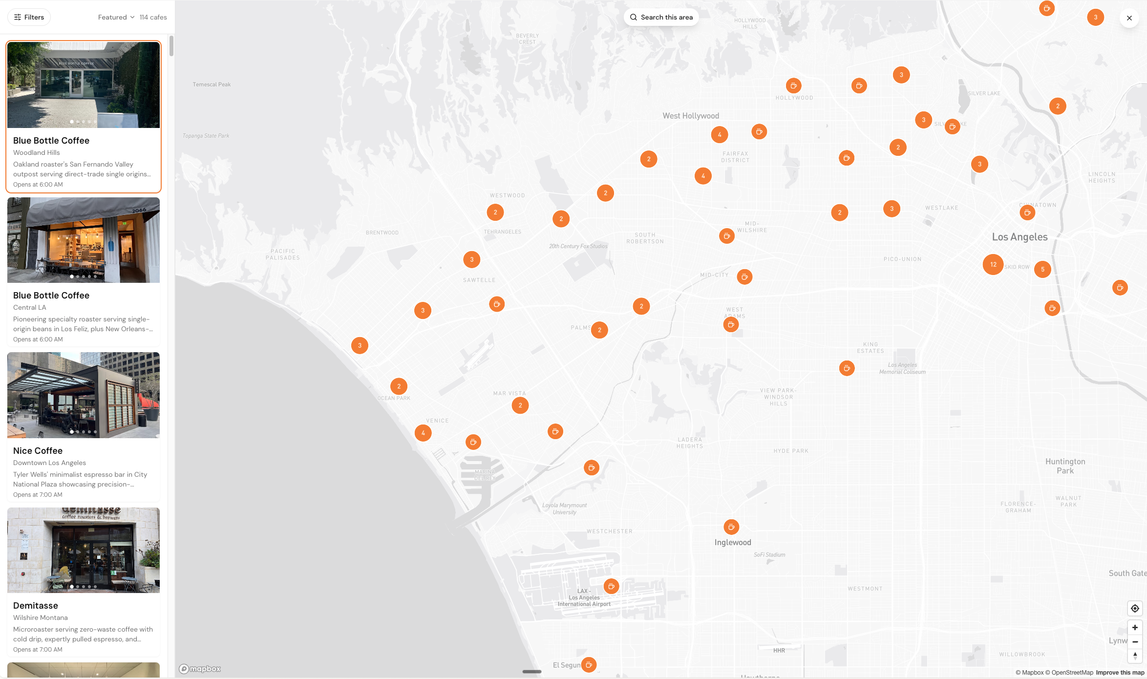 - 114 hand-picked specialty cafes across Los Angeles