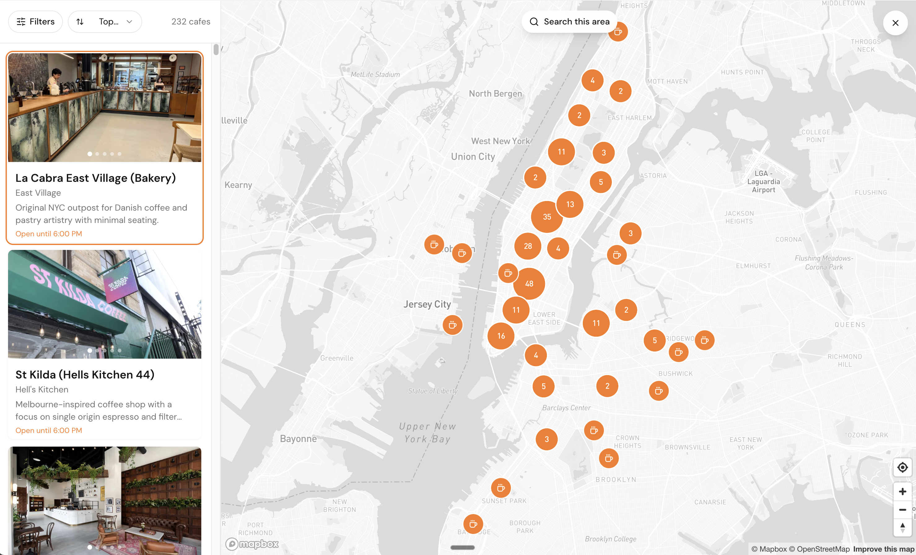- Smart clustering groups nearby cafes when zoomed out, showing counts at a glance