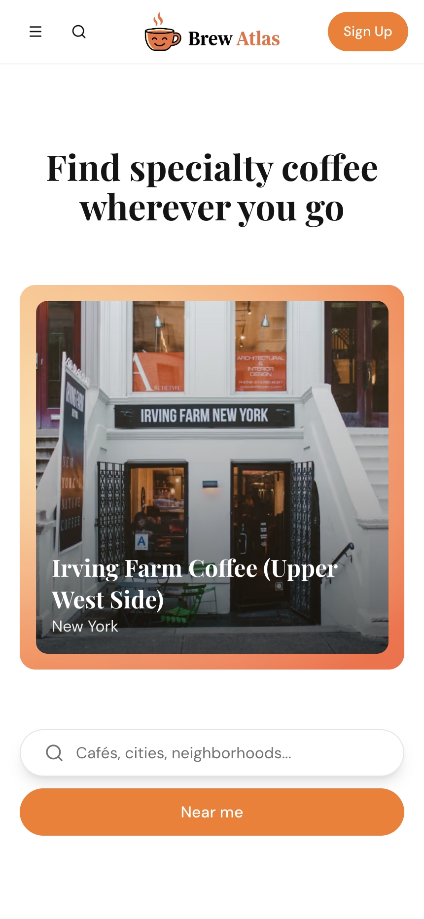 The home page has been completely rethought for mobile. A new full-screen hero showcases featured cafes in a swipeable carousel, with the cafe name always visible so you know exactly what you're looking at. Search and Near Me are right at your fingertips.