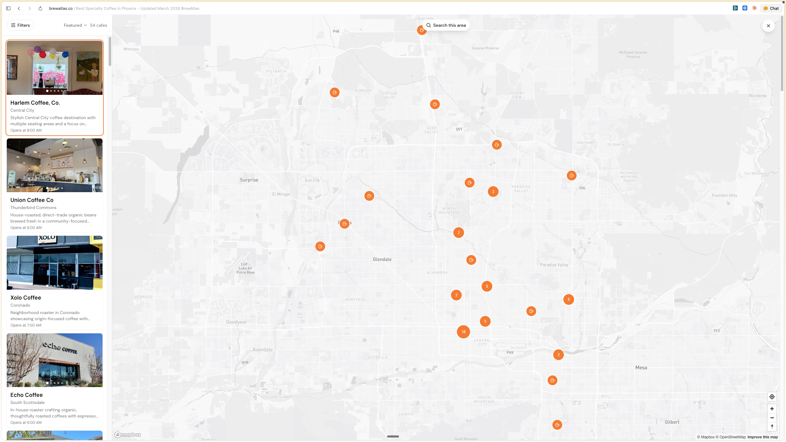 - 54 hand-picked specialty cafes across Phoenix
