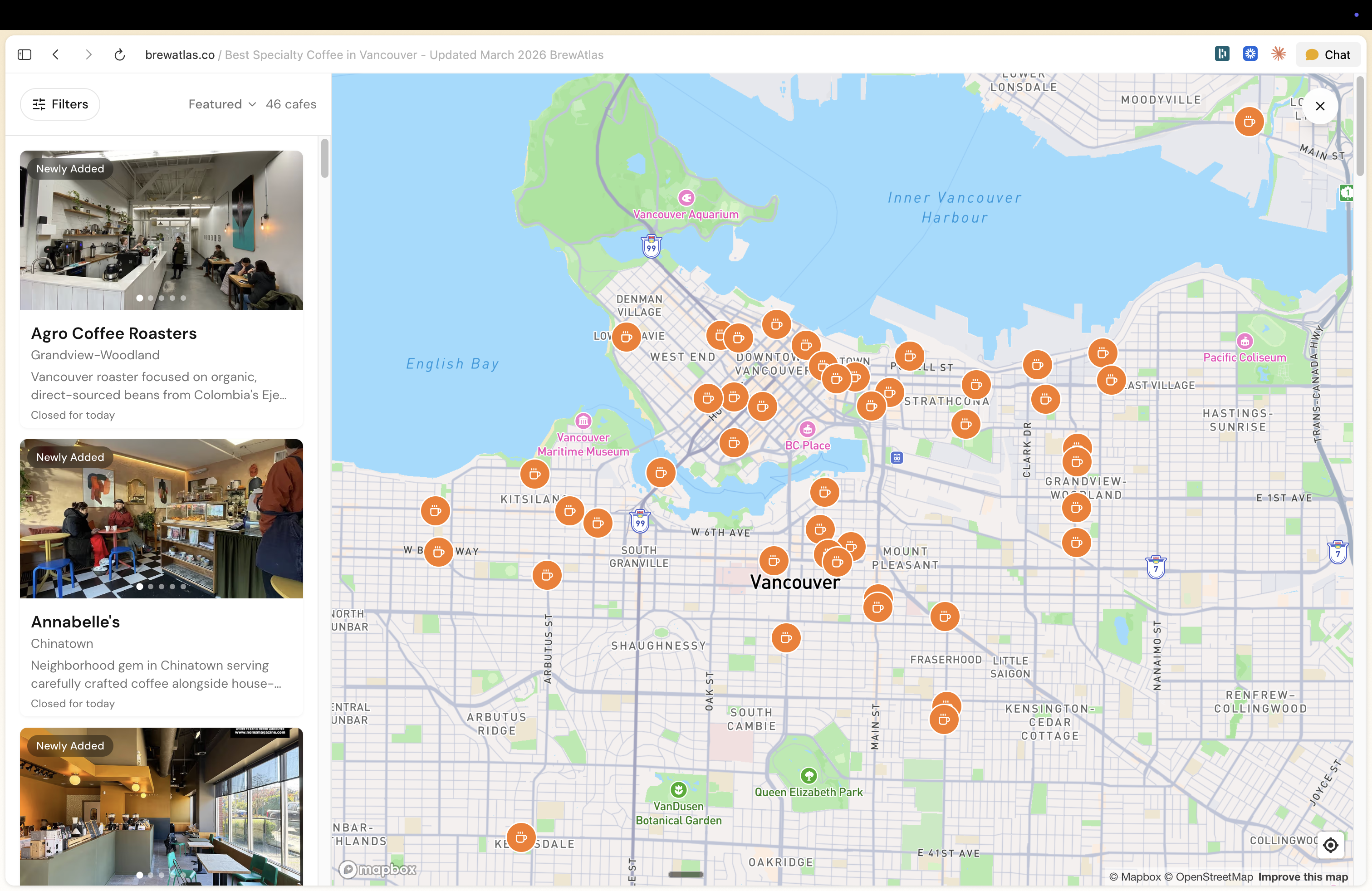 - Full interactive map spanning Vancouver's vibrant coffee scene