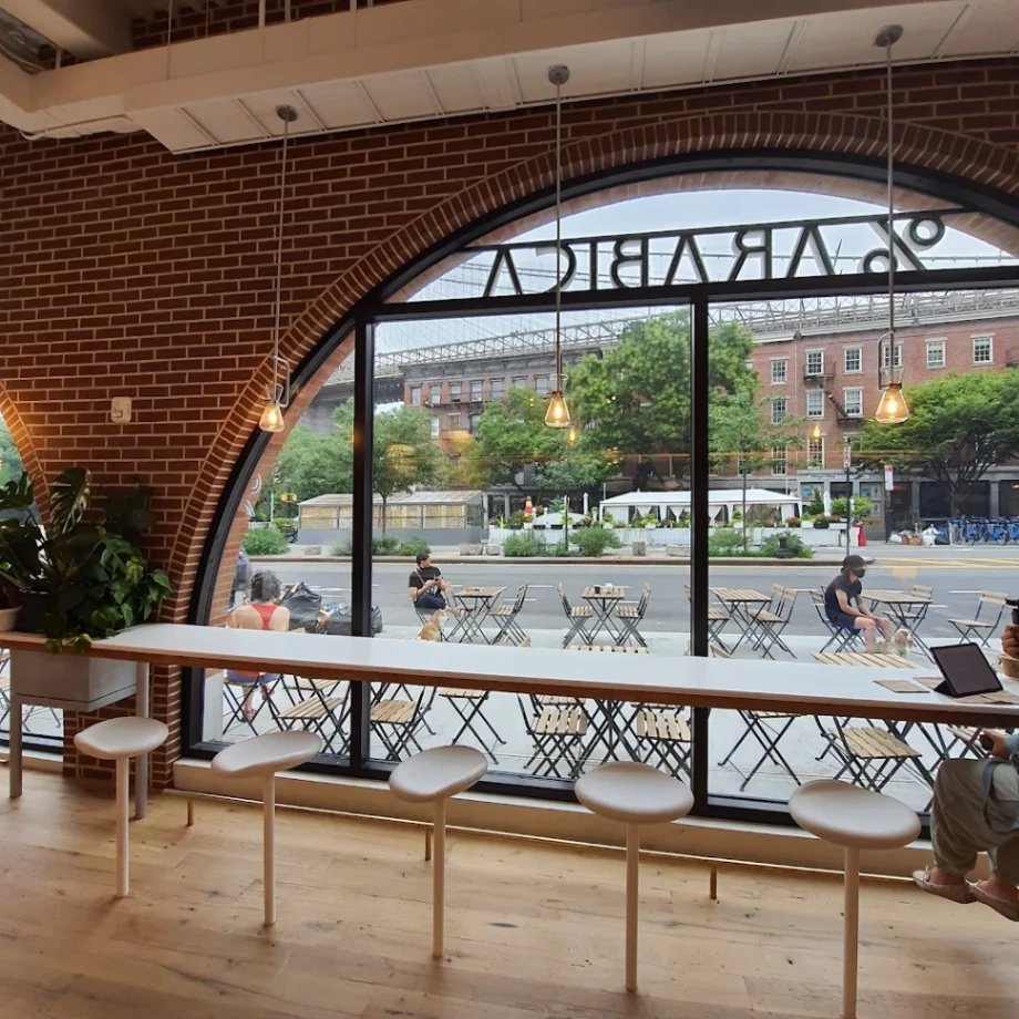 Arabica Dumbo Roastery is the largest NYC location with an open kitchen, bakery, and retail space in the artistic Dumbo neighborhood known for quality coffee and vibrant community.